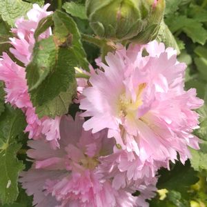 タチアオイ🌸 優しいピンクの八重咲きタチアオイが二年目も咲きました🥰 ベビーサンローズ🩷 小さ苗買って、今は四鉢もりもり元気です。 小さなお花が可愛🩷🌸🍀