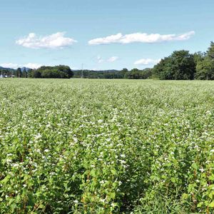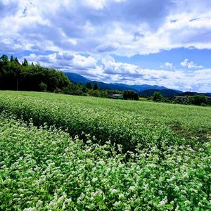 峠の麓のそば畑。 10haはあると思います。 畑の向こう側まで1000mはあるよ。