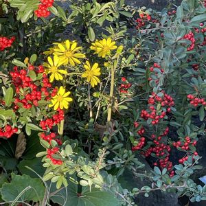 ピラカンサにモテモテのツワブキ🔴🔴🔴🔴🔴 🔴🌼🌼🌼🔴 🔴🔴🔴🔴🔴