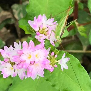 ミゾソバ 🌸花言葉 純情、etc 🌝バッタくんはミゾソバの花から微動だにしませんでした。純情なやっちゃ👍
