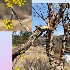 サンシュユ(ミズキ科) 4/4 春の遅いここ地方 まだ屋根から落ちた雪が残って いる場所もあります 森の中は雪で折れた枝や倒れた木があちらこちらに見られます この山茱萸も雪の重さに耐えられなかったのか? 折れてしまったようです その折れた枝からもちゃんと花をつけてる❣️ 植物の生命力を感じます💕