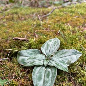 少し戻ります 4/4 バイエルンの森 ミヤマウズラ(ラン科シュスラン属)の根生葉だと 思いますが?? 違っていたらご指摘下さい ミヤマウズラの葉には葉脈に沿って網目状に白っぽい斑紋が入り、これをウズラの羽の模様にたとえたことが名の由来 葉の模様は変化に富み、斑紋が目立たない個体もある 一昨年ここで初めてミヤマウズラを見ました(2021.9/1.9/2投稿) 何故か去年は見つけられなかったのですが今年また会えるといいのですが💕 ミヤマウズラではないのでは?とコメ頂きました 改めてこのロゼットは何でしょうか? わかる方いらっしゃいましたら教えて下さい🙇♀️ ツルリンドウのようですねー⁉️