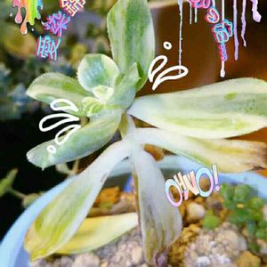 ㊧㊦春萌 コメリ出身。 色も葉も…薄くなり、 下の方から葉が落ちてきた。 葉の付け根に黒い微細の点があった。黒星病?黒点病? “花いとし”噴霧とこの春萌も避暑地で養生…。 メルカリ出身・元寄植えの春萌を寄せ直した子の方は元気そうな春萌らしい緑色。 夏だからか?小さくなった。 黒星病?か分からないけど、そういう微細の点はあって、薬の噴霧と怪しい葉を取り去って無事っぽい。 梅雨時の曇り空が続いてから様子が変化した。 戻り梅雨が終わってアプリの予報は晴れ続き。 このところ数日、夜間が涼しい。大人猫のいる居間の窓開けてた。 外の多肉にも過ごしやすかったかな。 去年のお盆前後の長雨は…育成ライトまだ無かったんで、 それで当時はまだ多肉少なく、室内窓ぎわ置きで徒長と弱ったサブセシリスの変わり果てた姿が…:;(∩´﹏`∩);: 外用にも防水育成ライト欲しいくらいだ…(º﹃º):.*೨ それはタイマー無いからな…。 差し込んで使うタイマーもあるようだけどお安くない( ´・ω・`) で、画像㊧㊦以外は春萌錦。 うちのはこんな斑のは入り方。 暑さ?で茎立ちしたけど、葉の綺麗さを愛でて楽しむ…しかない(๑•̀ㅂ•́)و✧ 脇芽出て増えてほしいなぁ。 葉挿しで上手く綺麗な斑が出るとも限らないし。 親株からの脇芽なら! うちの春萌錦は斑入り以外の多肉と混在だから75%遮光(多分)カーテンで普通に遮光してるけど様子は元気そう。 同じ鉢に、ほろ酔い美人(季節斑)と石蓮花錦を植えてるけど、見分けが付かなくなった(゚∀゚)アヒャ 育成期〜冷え込みの頃にまた丸っこくて綺麗な姿…が観たいな(๑•̀ㅂ•́)و✧