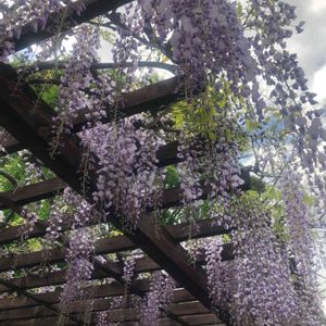 白藤。 紫の藤が満開を終えて、隣では白い藤が綺麗に咲きだしました。 熊蜂の大きな羽音と影が🐝あったので、私も静かにしていました。