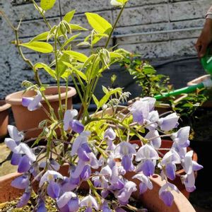 旦那の鉢植え⬅️❓が並んでる ウチの店裏。 休日の度に 自分家の山へ探検に行く友人が 色々採って来ては 挿し木🌳にした鉢を 置いて行くらしい😅 先日、唐突に「フジガサイトルヨ」と言った旦那。 確かにあった✨ 小さい藤の花😆 ちゃんと咲いててウケた😂