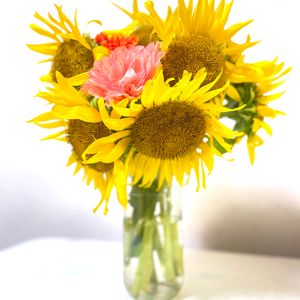 今日のお花 ヒマワリ🌻 先週末投稿のひまわり畑では、切り花の持ち帰りができたので、しばらく自宅でひわまりを楽しみました😊 ピンクのお花は造花です。 娘が飾りつけてくれました😃 酷暑に大雨と厳しい日々が続いていますが、 皆さんお元気に良い一日となりますように❣️