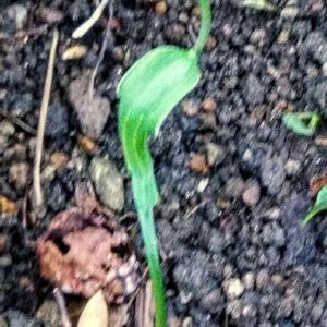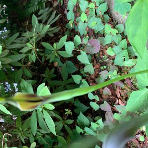 セダムの中から突然出てきてました! どこかから種が飛んできたのでしょうか? 食虫植物ですか? 蛇の花?