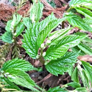 樹木の芽かと思って撮ったのですが、ウワバミソウと言う山野草でした。 白い小さいのが花のようです❣️