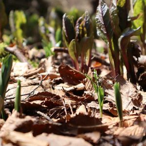 ハシリドコロとユキザサの新芽が出ています。キバナノアマナの蕾も。 4と5枚目は何でしょう?