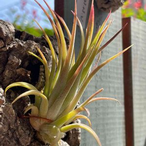 朝のイオナンタ 葉先のピンクからピスタチオみたいな緑へのグラデーションが綺麗 紅葉が冷めていないのでしょうか パイナップル科チランジア属