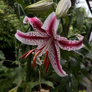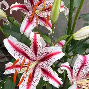 オリエンタルユリ デイジー✨✨随分遅くなってからコンテナに植え付けたけど、咲いてくれました🙌🙌今日は雨☔️で慌てて軒下に移動しました💦