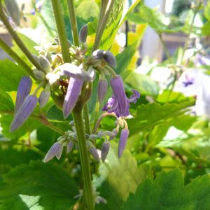 23.3℃🌅/33℃ クレマチス 歩々 クルリンの小花がかわいい💜🎶 これから秋が深まると、紅葉して金色に輝く葉っぱもとってもキレイで🍁✨ 私の花壇のシンボルクレマチス.。.:*♡
