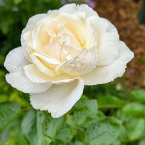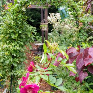 今日は朝から雨で通路も草木が雨で垂れ下がって小道を塞いでる状態です。 手前はオールドローズのべーシーズ・パープル・ローズです。