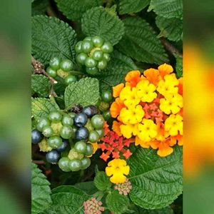 (*^^*)こんにちは!🌿 ランタナの花と実が一枚の写真📷に、仲良く収まりました❣️ ☆ランタナ(和名:シチヘンゲ) ☆クマツヅラ科、シチヘンゲ属 花後の実は、緑色から熟すと青に変わります。🌿 緑色の実も、 熟して青くなった実も、それぞれ宝石💎のようで、とても素敵です!❣️ ☆夢の島熱帯植物館 ☆2019年7月3日 今日も良い時間を お過ごしください。🍋🌿✨ ✨✨✨✨✨✨✨✨✨✨🌿