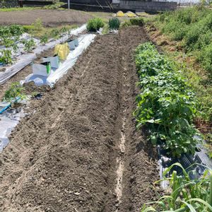 ~"インカのめざめ"は再び目覚めてました~ →前回からの続き 花が咲く直前に病気で枯れたジャガイモ"インカの目覚め。枯れた後にイチゴが繁ったので放って置いてました。 本日、イチゴを植え替えたので耕してみると、、、 大量の芋が‼️100パーセント発芽😱 どうしようもなく植え直しました。この後、土を被せて実験開始。こんな時期に詰め詰め植えられたジャガイモ達の運命や如何に🌀 それは次回の講釈で🎵
