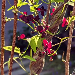今日の庭 今年はたくさんの小さな花をつけた 三つ葉アケビ☘️ 伸びたツルの行く先となる支え🌲が無く 無理な体勢に💦 ・・静観(;^∀^)