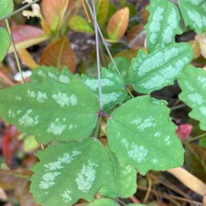 アケビの咲くフェンスの近くのお宅の塀にも三つ葉アケビが咲いていました。 こちらの葉は周りの波線がくっきりしていて、雌花の花びらはすべて落ちていました。