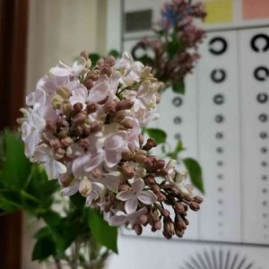 【骨董と花生活 月曜日】 駅で花農家の特別販売があり ライラック2本とエリンジウムとバブリア2本とレースフラワー2本で1290円。ライラックと写真ではよく見えないエリンジウムで玄関に初夏が来た✨バックには視力検査板をそえて、、、