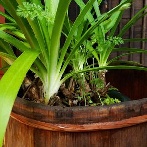 手桶 no.3 桶の中の鉢に アガパンサスとこぼれ種のオルレア 直径28cm 高さ44cm。箍三ヶ所の桶は 何に使われていたのか?!後ろの板は 水屋箪笥の戸。右にホース 左に明るい扉を隠す仕切りとして使用。色あせた木製品に水をかけると いい感じに✨