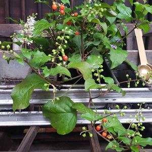 切り花が好きで また繁り過ぎな植物をカット! 植物はランタナを中心にパイナップルミントとワイヤープランツ 器は江戸時代の蕎麦猪口&糸巻