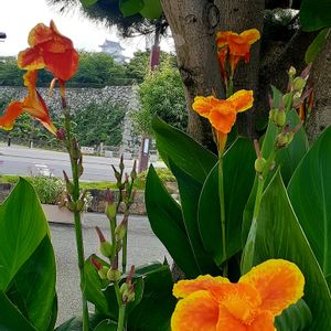 「素通りしないで…」 呼び止めらてしまった… 真っ赤な可愛いお花💖💖 夏に咲くお花では… 辺りの幹が邪魔して… お城🏯が半部だけです…