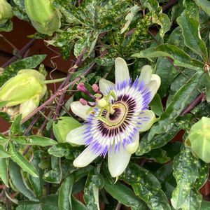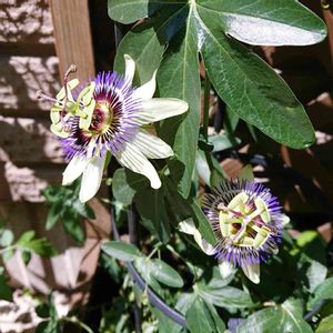 パッションフルーツ 時計草 放ったらかしでよく咲くというか ヤバいくらい延びます❗つるばらの上を覆うように元気です。 双子みたい でもよく見ると違う… 我が家の双子みたい 😏😃