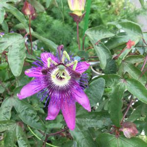 撮り溜めていたお花の写真💜 ÜPが追いつかないので連投失礼します🙇🏻♀️ いつもは真上から撮るから、 今年はちょっと横からΣp📷ω・´)💜 ほんとに不思議で見とれてしまうお花💜 トケイソウ⏰ 名前の由来は雌しべが3つに分れてて 長針短針秒針のように見えるかららしい🕰 綺麗なんだけど、 地下茎で増えてしまうのが悩み💦