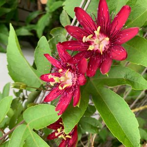 2年目のトケイソウ・インセンス。楽勝で冬越しして連日開花中です。 すでに蕾が30個以上ついてます。 インセンスは地上部がすっかり枯れた状態でも屋外にて冬越し出来るのですが、春に新芽が10本以上出てきてた(!)ので5本残しました。 でも今年はパッションフルーツも同じネットに加わっているので多すぎたかも…😅 すっかり出遅れていたパッションが今日初めて開花したので、花粉を貰って付けてみました。 どんな種が出来るかな。もし実が出来たら食べてみます。クッソまずい気もしますが…😅