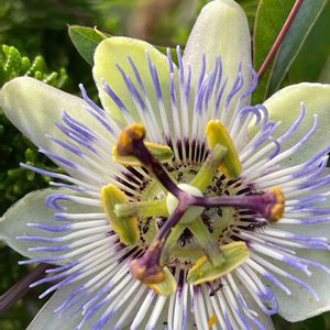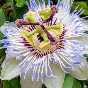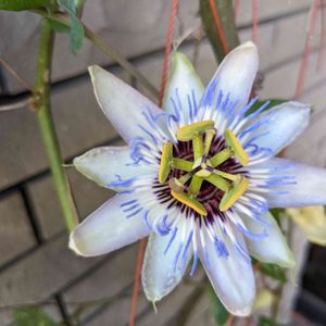 トケイソウ(パッションフルーツ) 通勤路の途中にあるお家のコンクリート塀を乗り越えて咲いていました。 昔、お義母さんが何かの木に絡ませて育てていたのに、わからずに切ってしまった。 後に、プランターで育てグリーンカーテンにしたかったけど、育て方がよく分からず枯らしてしまった。台風の影響で潮風にあたったのかも😥 上手に育てる方だとパッションフルーツが実るのかな?実がなってるの見れるといいな😊