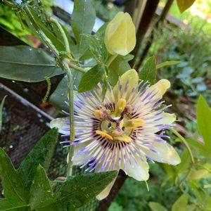 時計草です。いつ咲くんだ?と観察してましたが、一向に咲かないので、ほっといたら咲いてました。蕾から開花までが長い❗️パッションフルーツの名前でも販売されているようなので、ありんぼがよく登っているのでしょうか。