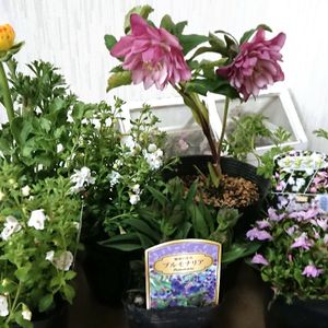 いつもの花屋さんでの戦利品🎵 八重の白いパコバ2株 黄色の花弁に赤いストライプ付き♥️真ん中ライムグリーン のラナンキュラスさん プルモナリア ブルーのお花 サギゴケ ラベンダーピンク 白のアネモネ クリスマスローズダブル 7株で1505円💕ねっ❣リーズナブルなお値段でしょう♬