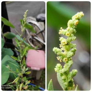 謎の雑草に花が咲いて、やっと画像検索で答えが出た たぶんシロザ 違ったら教えてください (-人-)