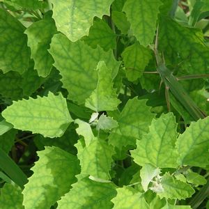左隣にある葡萄と一緒に種を蒔いたところ、このような植物が育ちました。特長は、葡萄のようなツルはなく、葉の裏が白っぽいです。お教えいただけますようお願いします。