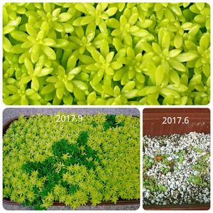 オウゴンホソバマンネングサ(黄金細葉万年草) 別名:ゴールデンカーペット 昨年冬に処分価格で名前も分からないまま綺麗な色に一目惚れ購入のセダム。 皆さんの投稿みて、名前が分かりました。 伸びた芽をカットして、多肉植物用の土を入れたプランターにばら蒔いて、外に放置しておくだけで、こんなにモリモリに育ちました💚 次は、地植え…というかアプローチのブロックの隙間にばら蒔いて育つか、チャレンジしてみたいと思います🤔