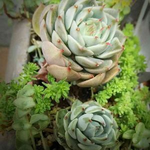 丸葉万年草、元気にいっぱい~💓💓 一緒のエケベリアらしきのは、名無しさん。 withワインボトル鉢と植え替え待ちなハムシー。