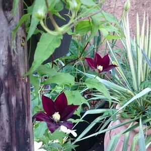 クレマチス はやて こちらもフロリダ系 咲は始めは緑でしたがだいぶ赤紫になりました この後もう少し濃い色になると思います