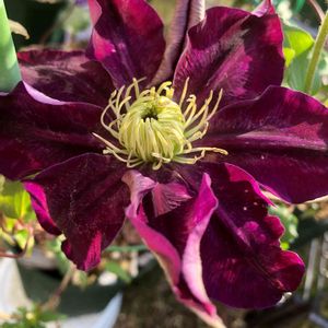 クレマチス はやて です 花形が乱れがちな品種ですが、 行き過ぎて半八重になってます 他のはここまでではないですが、肥料が効き過ぎてるのか??
