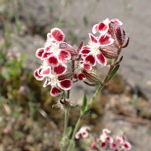 マンテマ ヨーロッパ原産の一年草。 江戸時代にヨーロッパから、やってきたそうです。 最初に見たのは、一昨年の5月で、富山県の海岸の砂地でした。 今回、富山県の市街地の道路の植栽の下に咲いているのを見つけました。 マンテマは、シロバナマンテマの変種だそうです。 花は、異国情緒たっぷりで、花弁に赤い斑点があります。全体に長い毛が生え、ねばねばしていました。 萼筒に赤みを帯びた縞模様が何本もありました。同じ向きに咲いていました。(①) 花弁の内側に鱗片5個。それぞれ、2裂していました。(②) 葉は、ヘラ型で、対生していました。(③) こちらは、同じ場所に咲いていた、シロバナマンテマ。花の色は、白いというより、ピンク色でした。斑点はありません。長い毛と腺毛がたくさん。(④) マンテマと同じ葉っぱでした。(⑤) 5.2 富山県