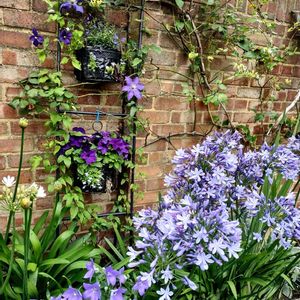 今日のお花、アガパンサス💙 白いアガパンサスは、もう少し後に咲きそうです😊 クレマチスは、大きいタイプと小ぶりのタイプで名前は不明です🤔 2つのハンギングは、鳥籠を改造して作りました🤗いつモリモリになるんだろう?!
