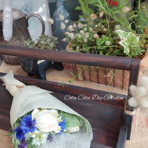 お嫁さんへの誕生日プレゼントを入れる木製トレーを作ってみました。 後ろの寄せ植えも作ってみました。