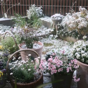 3月21日 朝起きたら 庭が真っ白だった 軒下に置いてる鉢植えにも 雪が❄ フェンスには バラを誘引する ワイヤーを張っています