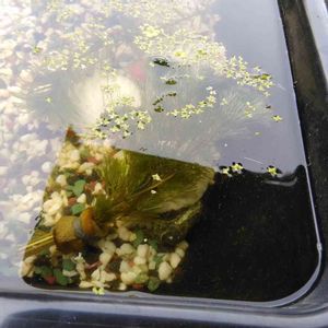 衣装ケースで( ̄▽ ̄;) ビオトープ····· 浮草や布袋草がゆらゆら涼しげです。 雪が降る頃には、衣装ケースのフタを閉めますw