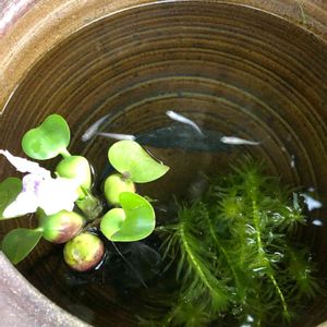 分かりづらいですが、ホテイアオイの花が咲きました。 メダカちゃん達も一緒に撮ったもんだからほんと分かりづらい💦 失敗😣