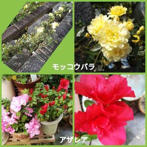 モッコウバラ ブロック塀に這わせてます。 斜めにしてます。長さを見るのに💦 アザレア 赤はツボミが今からです。