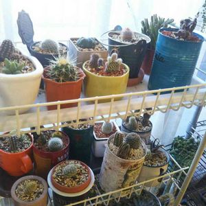 キッチン、食器棚の上。 リメ缶植えのサボちゃんたち。