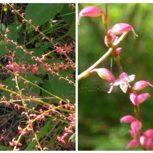ミズヒキ タデ科ミズヒキ属 多年草 薄暗い場所に多いが、縁起物である。 花期は8~10月 鈎状のものが雌花で、花弁のような萼のあるものが雄花です。 花は盛りが過ぎると雌花だけが残るそうです。