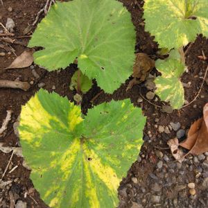 斑入りフキ キク科フキ属の多年草 早春の花茎はフキノトウです。 地下茎から多くの葉柄を立てて、一部が切れた円い大型の葉をつける。この葉はハート型ですね。 🏷️8日は葉っぱの発表会 に参加させていただきます。