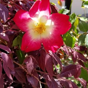 薔薇カクテル あ!もしや!と確認しに行ったら、やはり開花していました🙏 存在を忘れるところだった。これが最初の一輪で咲いたばかりのよう😊 ガレージから、隅っこを見上げるようにしないと見えない変な場所に植わっていて庭からは見えないのです。(私が植えたのではありません😣)