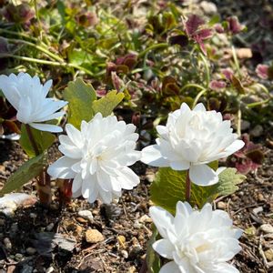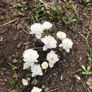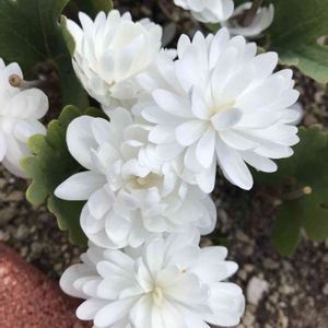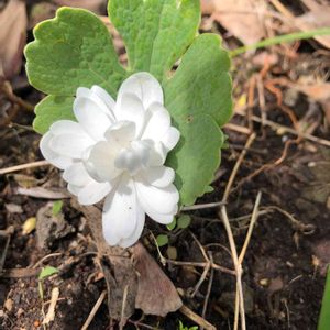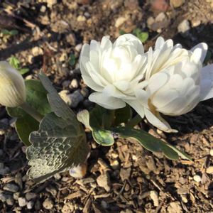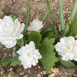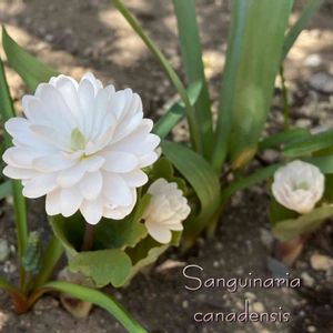 昨年花が終わった苗を頂きました🤍 名前も知らない😅 産直で650円もしてた😆と それから、 名前は、650円さん💕 背丈10cm位の 650円さんに こんなに 清楚な花が🤍🤍🤍❣️ 山野草かな🤔 650円さんの名前 よろしくお願いします🙇♀️ 早速ぷりぷりむらさんより 八重咲きサンギナリア カナデンシス と教えて頂きました。 調べてみると、 つぼみが葉にくるまれた柏餅のような姿と❣️確かに😳 根や茎を切ると赤い血🩸のような汁が出る事から『ブラッドルート』とも呼ばれている😱切らずにおこう😥 和名 八重咲きカナダケシ スッキリしました😅 ありがとうございました😊
