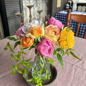今秋の薔薇はことごとく虫さんにやられてしまいました…😵💫 その中で比較的無事だった子たちを摘んで花瓶へ💐 サントノーレ グラハムトーマス サボン レディオブシャーロット ラ・パリジェンヌ ミスティパープル グリーンは アスパラガス・スマイラックス 斑入り羽衣ジャスミン ミルキーウェイ